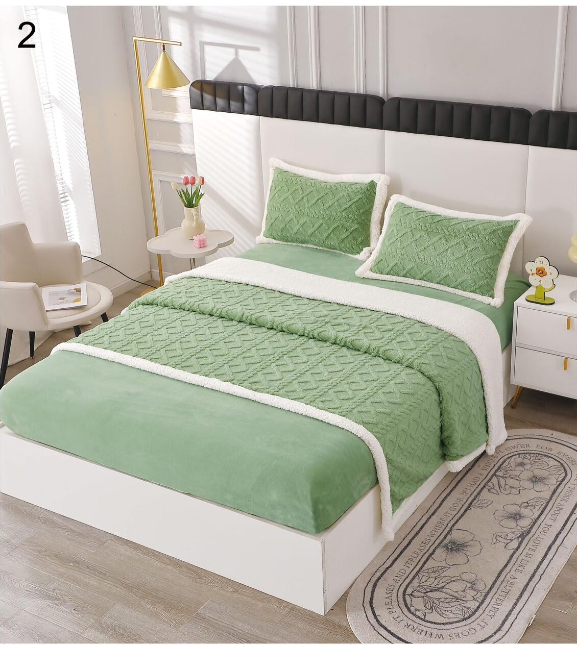 Quilted Cotton Quilt With 4 Pillowcases Set contains:– blanket 230x250cm- two pillowcases 60x80cm- two pillowcases 55x55cmAbout the material:Quilted cotton has a dense texture and is pleasant to the touch. It is a delicate material, but resistant and easy to maintain.It is perfect both for hot summer days and for colder days.Maintenance instructions:– wash at a maximum of 30°C automatically- no chemical bleaches are used- iron at maximum 130°C- it is recommended to wash before the first use for proper hygiene.- drying in the sun is not recommended.Packaging method:Clear plastic case with handles, perfect for gift giving.Product images are for presentation purposes and there may be slight differences in shade due to your phone or monitor settings.Dimensions may vary by +/-5%.