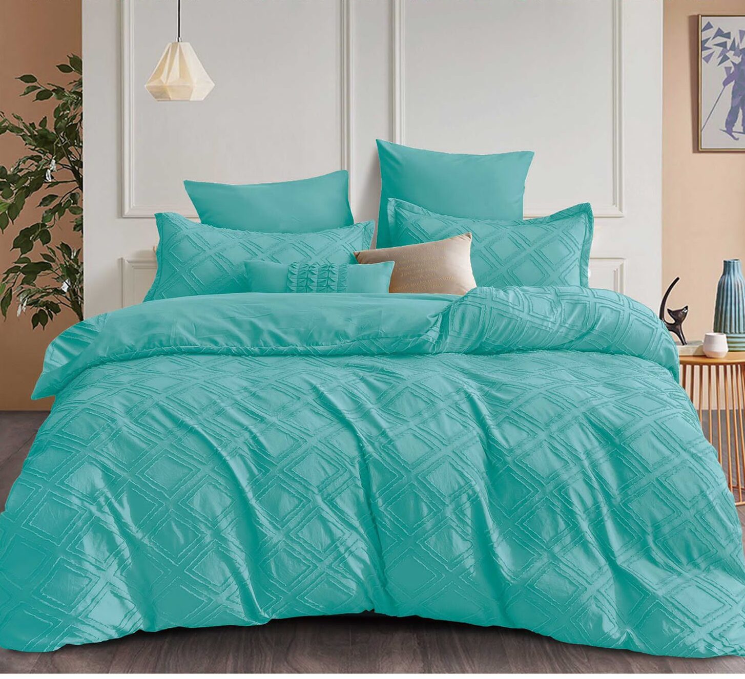 Quilted Cotton Quilt With 4 Pillowcases Set contains:– blanket 230x250cm- two pillowcases 60x80cm- two pillowcases 55x55cmAbout the material:Quilted cotton has a dense texture and is pleasant to the touch. It is a delicate material, but resistant and easy to maintain.It is perfect both for hot summer days and for colder days.Maintenance instructions:– wash at a maximum of 30°C automatically- no chemical bleaches are used- iron at maximum 130°C- it is recommended to wash before the first use for proper hygiene.- drying in the sun is not recommended.Packaging method:Clear plastic case with handles, perfect for gift giving.Product images are for presentation purposes and there may be slight differences in shade due to your phone or monitor settings.Dimensions may vary by +/-5%.