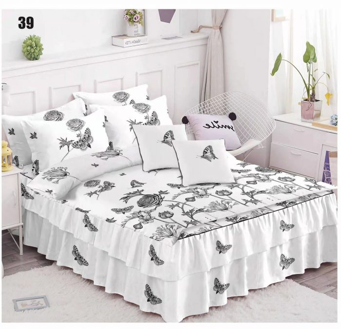 On the bottom of the bedspread, you have placed the superb frills, which give these models elegance and sophistication.The pillowcases close with a flap (stitched).The bed sheet has an elastic on each corner that is attached under the mattress, in order not to allow the sheetto slide off the bed.Packaging method: bag with handles, being ideal for a gift.